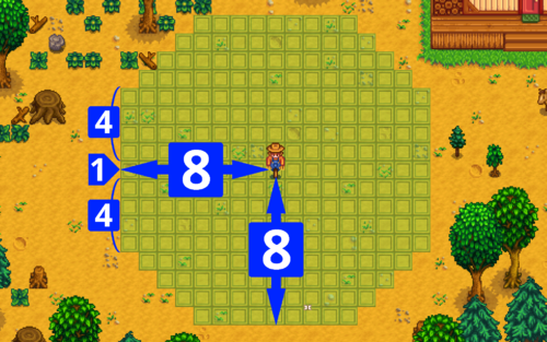허수아비는 앞뒤양옆으로 8칸 대각선으로 6칸 범위 내에서 까마귀로 부터 작물을 지켜준다